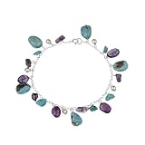 You'll feel like heading to a summer music festival or beachcombing for treasures in the sand when you wear this Sterling Silver with Turquoise, Amethyst and Silver Bead Drops Bracelet. Dangling like charms from the rolo chain, turquoise and amethyst stones range from petite and precious chips, to larger, smooth nuggets. The balls of sterling silver add a little light to the ring of rich purple and blue. This bracelet is seven and a half inches long with a lobster claw clasp closure. With subtle variation in stone size and color, each bead is as special and unique as the next.