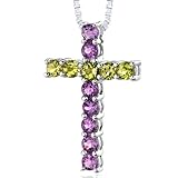 Sterling Silver Rhodium Finish 1.50 carats total weight Round shape Amethyst and Peridot Cross Pendant Necklace