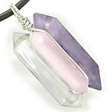 Made with Pure 925 Sterling Silver and from Genuine Gemstones Double Terminated Crystal Points Size: 40mm Long X 22mm Wide, Includes 2 Large Crystal Points and 1 smaller Crystal Point in the Center. Combination of Three Crystal Point Gemstone Wands holding Universe Positive Energy Powers of Good Luck, Magic and Protection. Individual Crystal Points of Crystal Quartz, Rose Quarts, Amethyst Gemstones. All Gemstones are Natural and no two Amulets are ever a like. Each Amulet is Handcrafted with Love and Care. Also Comes with Very Popular 18" Black Rubber Cord and 925 Sterling Silver Buckle. This is UNIVERSE POSITIVE ENERGY Amulet, as it comes with Individual Crystal Point Wands and each holds different and Unique Energies and Forces. Gain Self Protection, Good Luck and Magic powers with this Fantastically attractive and one of the Kind piece of Jewelry. It is Made with Pure 925 Sterling Silver and will last forever. It also comes with Very Popular 18" rubber cord necklace, which has 925 Sterling Silver buckle and makes this Amulet ready to wear. Amulet is made with Love and Care and no two pieces are ever alike, making your Amulet as unique as it may get. This Amulet is Made from Genuine and Natural Crystal Quartz, Rose Quartz and Amethyst Gemstones. Each is Handcrafted as Crystal Point wand and makes this Amulet very Special and Attractive. Crystal Quartz Gemstone stands for Evil Eye Protection and Healing Powers. Rose Quartz Gemstone stands for Love and Attraction Powers. Amethyst Gemstone stands for Good Luck and Travel Protection Powers. Combination of all three Gemstones creates Unique Universe Energies and Powers for it's wearier and fills Life with harmony, balance and positive forces. You will absolutely Love your New Amulet and Enjoy it's Unique Outlook.
